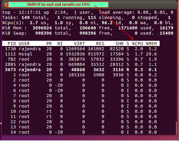 - Sort by CPU: Suppose we want to sort out the results based on the CPU time. We need to press (Shift+ P) to sort out the results on CPU time