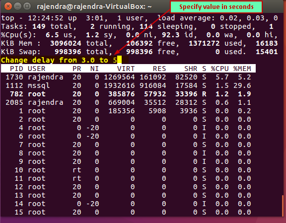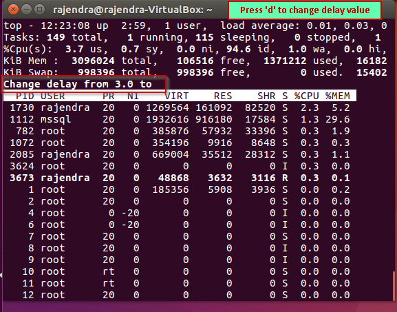 Alternatively, if we want to change the refresh interval from 3 seconds, press ‘d’ and enter the delay value in seconds.