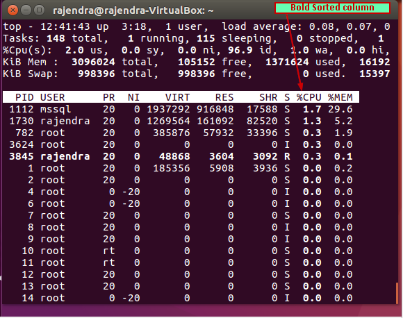 There might be cases where we forget on which filed we sorted out the results. Therefore, you can press ‘x’ and it will highlight the current sort column from the output. In below image, you can see ‘%CPU’ is showing up in bold characters. It means, our result is sorted out on this field. Similarly ‘y’ to highlight the row of running tasks.
