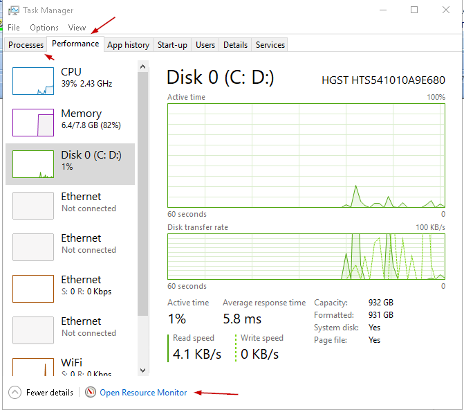 We can get more detail in the window system using the ‘Resource Monitor’ as shown here: