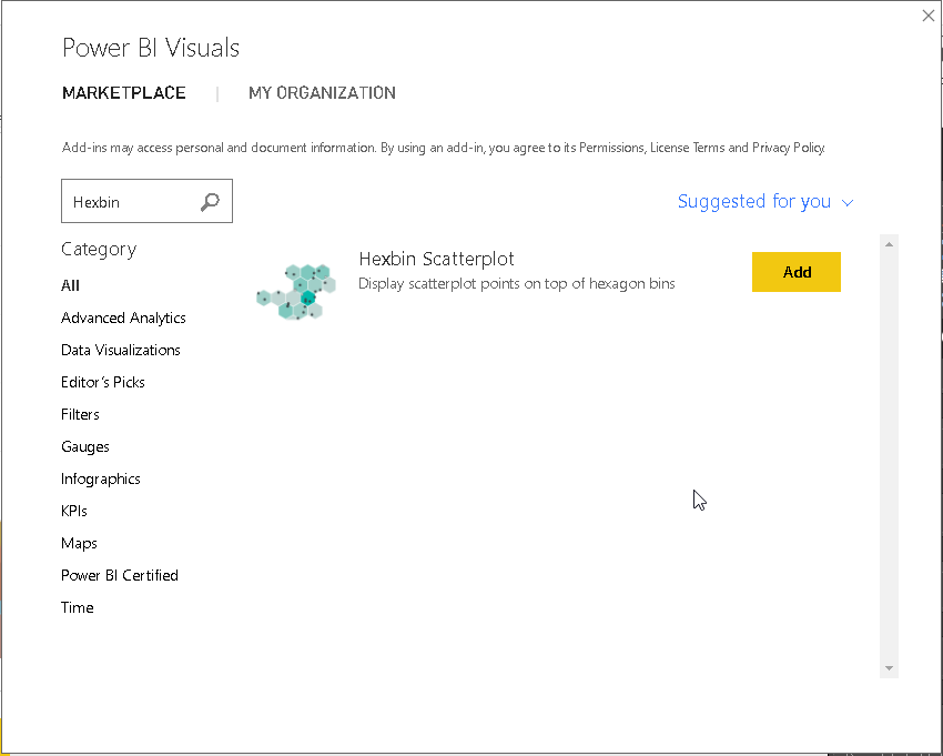 Go to the link ‘Hexbin Scatterplot’ and get details of it from Power BI visuals.