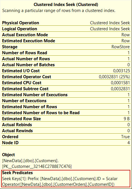 The clustered index insert is performed on the outer table (CustomerOrders) for each CustomerID row an index seeks operation is performed. This case is shown in the seek predicate property of the clustered index seek operator.