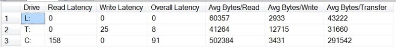 Create Table #DiskInformation (DISK_Drive char(100),DISK_num_of_reads int, DISK_io_stall_read_ms int, DISK_num_of_writes int , DISK_io_stall_write_ms int , DISK_num_of_bytes_read int, DISK_num_of_bytes_written int, DISK_io_stall int) insert into #DiskInformation (DISK_Drive ,DISK_num_of_reads , DISK_io_stall_read_ms , DISK_num_of_writes , DISK_io_stall_write_ms , DISK_num_of_bytes_read ,DISK_num_of_bytes_written , DISK_io_stall) SELECT LEFT(UPPER(mf.physical_name), 2) AS DISK_Drive, SUM(num_of_reads) AS DISK_num_of_reads, SUM(io_stall_read_ms) AS DISK_io_stall_read_ms, SUM(num_of_writes) AS DISK_num_of_writes, SUM(io_stall_write_ms) AS DISK_io_stall_write_ms, SUM(num_of_bytes_read) AS DISK_num_of_bytes_read, SUM(num_of_bytes_written) AS DISK_num_of_bytes_written, SUM(io_stall) AS io_stall FROM sys.dm_io_virtual_file_stats(NULL, NULL) AS vfs INNER JOIN sys.master_files AS mf WITH (NOLOCK) ON vfs.database_id = mf.database_id AND vfs.file_id = mf.file_id GROUP BY LEFT(UPPER(mf.physical_name), 2) SELECT DISK_Drive, CASE WHEN DISK_num_of_reads = 0 THEN 0 ELSE (DISK_io_stall_read_ms/DISK_num_of_reads) END AS [Read Latency], CASE WHEN DISK_io_stall_write_ms = 0 THEN 0 ELSE (DISK_io_stall_write_ms/DISK_num_of_writes) END AS [Write Latency], CASE WHEN (DISK_num_of_reads = 0 AND DISK_num_of_writes = 0) THEN 0 ELSE (DISK_io_stall/(DISK_num_of_reads + DISK_num_of_writes)) END AS [Overall Latency], CASE WHEN DISK_num_of_reads = 0 THEN 0 ELSE (DISK_num_of_bytes_read/DISK_num_of_reads) END AS [Avg Bytes/Read], CASE WHEN DISK_io_stall_write_ms = 0 THEN 0 ELSE (DISK_num_of_bytes_written/DISK_num_of_writes) END AS [Avg Bytes/Write], CASE WHEN (DISK_num_of_reads = 0 AND DISK_num_of_writes = 0) THEN 0 ELSE ((DISK_num_of_bytes_read + DISK_num_of_bytes_written)/(DISK_num_of_reads + DISK_num_of_writes)) END AS [Avg Bytes/Transfer] from #DiskInformation ORDER BY [Overall Latency] OPTION (RECOMPILE); Drop table #DiskInformationa |
