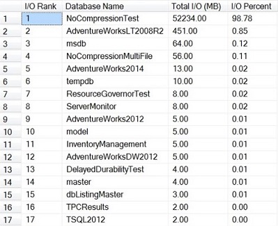 WITH AggregateIOStatistics AS (SELECT DB_NAME(database_id) AS [DB Name], CAST(SUM(num_of_bytes_read + num_of_bytes_written)/1048576 AS DECIMAL(12, 2)) AS io_in_mb FROM sys.dm_io_virtual_file_stats(NULL, NULL) AS [DM_IO_STATS] GROUP BY database_id) SELECT ROW_NUMBER() OVER(ORDER BY io_in_mb DESC) AS [I/O Rank], [DB Name], io_in_mb AS [Total I/O (MB)], CAST(io_in_mb/ SUM(io_in_mb) OVER() * 100.0 AS DECIMAL(5,2)) AS [I/O Percent] FROM AggregateIOStatistics ORDER BY [I/O Rank] |