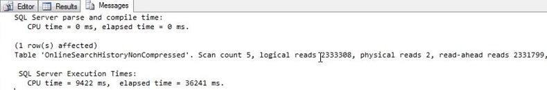 SELECT COUNT(*) AS [Row Count] FROM dbo.OnlineSearchHistoryNonCompressed WITH (INDEX(0)); |