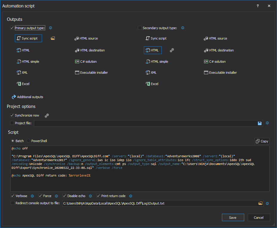 Additionally, a developer can create the automation script with a click on the Automation script button in the bottom-left corner of the Synchronization wizard and save it as a PowerShell script, or as a batch file, depending on preference: