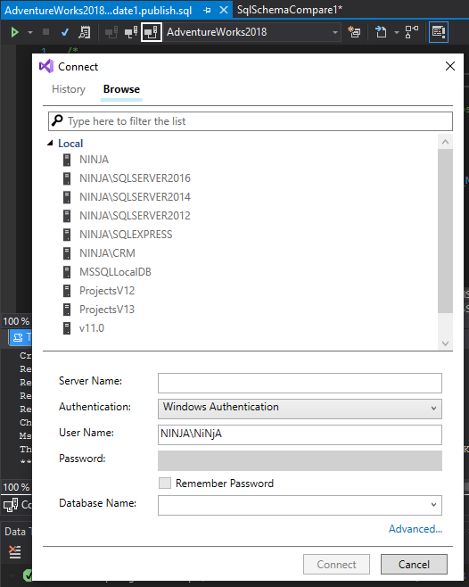 Besides comparing SQL Server database locally or on the network, Visual Studio can connect and compare Azure SQL Database as well. This is a neat feature, as it facilitates work for developers who are working on database development and need a quick way to synchronize the latest changes with the QA database, on which additional testing should be done before moving to production.