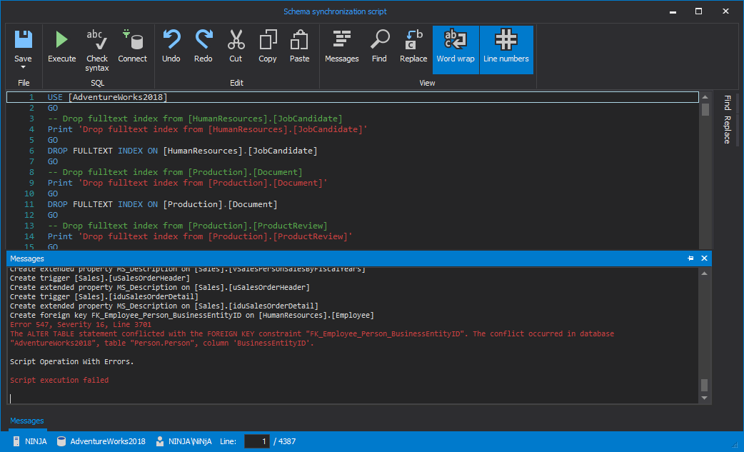 As it can be seen on the screenshot above, the Create synchronization script action can either Save script to a file on a default or any other desired location, or to open the created synchronization script in Integrated editor, or any other editor which can be set with a click on the Settings button in the Editor text box. If the second option is selected, at the end of the Synchronization wizard, the generated synchronization script will be shown and from there it can be reviewed, edited and executed: