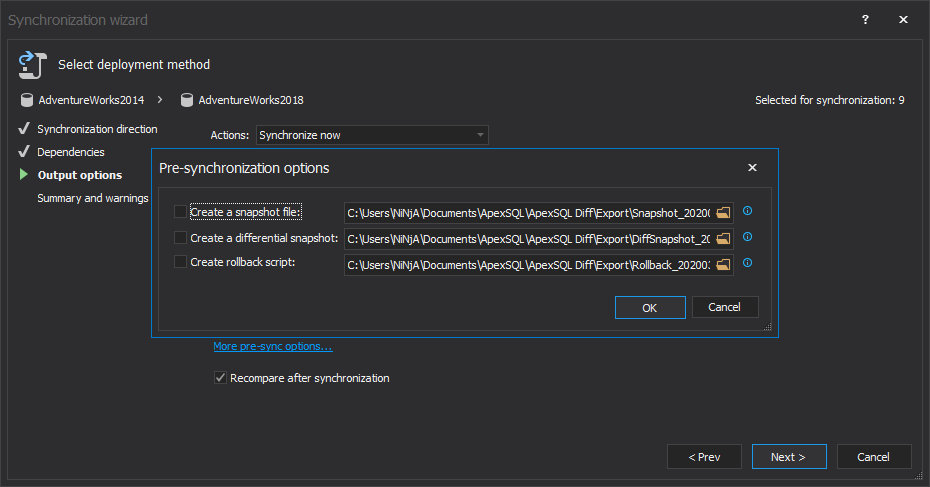 With a click on the More pre-sync actions link, additional three options are shown that can come in handy if a synchronized destination SQL database needs to be reverted to a previous state: