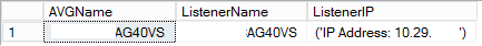 SELECT AV.name AS AVGName , AVGLis.dns_name AS ListenerName , AVGLis.ip_configuration_string_from_cluster AS ListenerIP FROM sys.availability_group_listeners AVGLis INNER JOIN sys.availability_groups AV on AV.group_id = AVGLis.group_id |