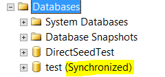The last point to check before starting our tests is that the replica to which the read-only workload is directed is in synchronized or synchronizing state. The synchronization status can be checked from the Databases node of the SQL Server Management Studio as follows:
