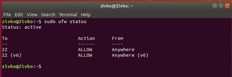 Now, when checking ufw status, it can be seen that port 22 is set/enabled in the firewall: