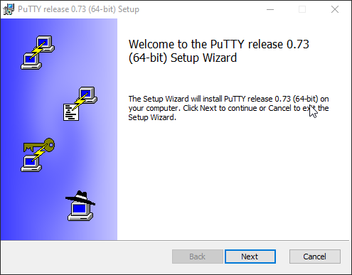 Double click on the putty-64bit-<version>-installer.msi installer. The Welcome window will appear. Click the Next button to continue: