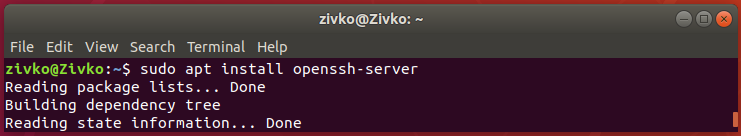 To install Secure Shell (SSH) on Linux Ubuntu 18.4, from the Terminal type the sudo apt install openssh-server command. Press the Enter key and type user password when prompted. Then press Y and Enter to continue with the installation: