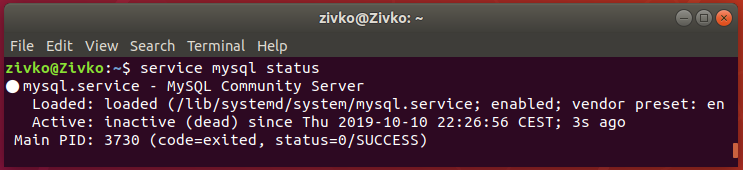 After setting up MySQL, make sure it is active and running. To see the status of MySQL, type and run the service mysql status command: