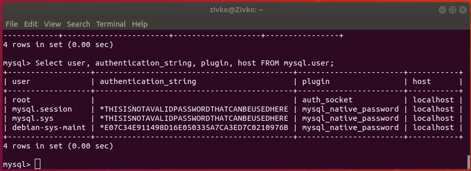 Now, when checking the authentication methods for the MySQL users, it can be seen that the authentication method for the root user is changed from auth_socket to mysql_native_password: