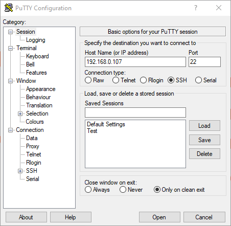 Now, go to the local Windows machine and launch PuTTY. In the Host Name (or IP address) box, under the Session tab, enter the IP address of the remote machine and click the Open button: