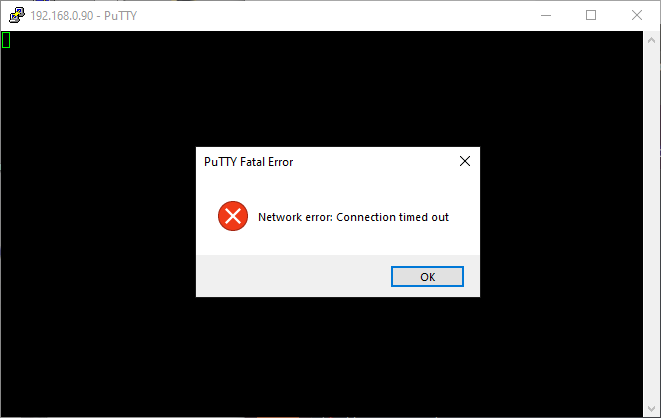 The same Network error: Connection timed out error message may appear if, in the Host Name box of the PuTTY Configuration dialog, you type a wrong IP address: