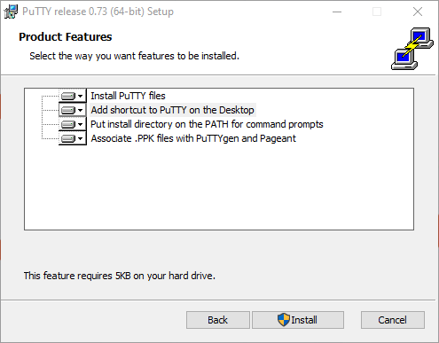 In the Product Features step, select the way you want the features installed. If you plan to use PuTTY frequently, add a PuTTY shortcut to the Desktop. Click the Install button: