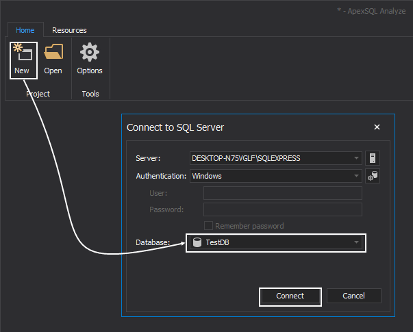To see object dependencies, on the Home tab, click the New button, under the Connection to SQL Server window, choose the SQL Server instance, pick the type of authentication, and after selecting a desired database in the Database drop-down box, click the Connect button: