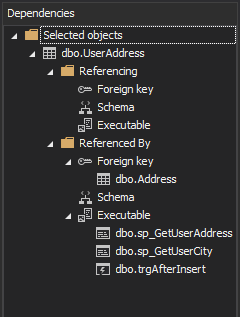 The Dependencies pane, the complete dependency chain for the selected object in the dependency graph (e.g. Address) can be shown. Referencing indicate the object that depend on the selected object (aka referencing) and Referenced by shows the objects from which selected object depends on (aka referenced):