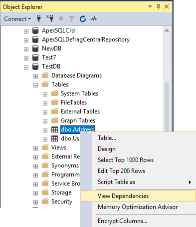 Another way to view dependencies between objects, but to create a visual SQL dependency tracker, is by using the View Dependencies option from SSMS. From the Object Explorer pane, right click on the object and from the context menu, select the View Dependencies option: