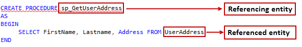 EXECUTE sp_depends 'sp_GetUserAddress' |