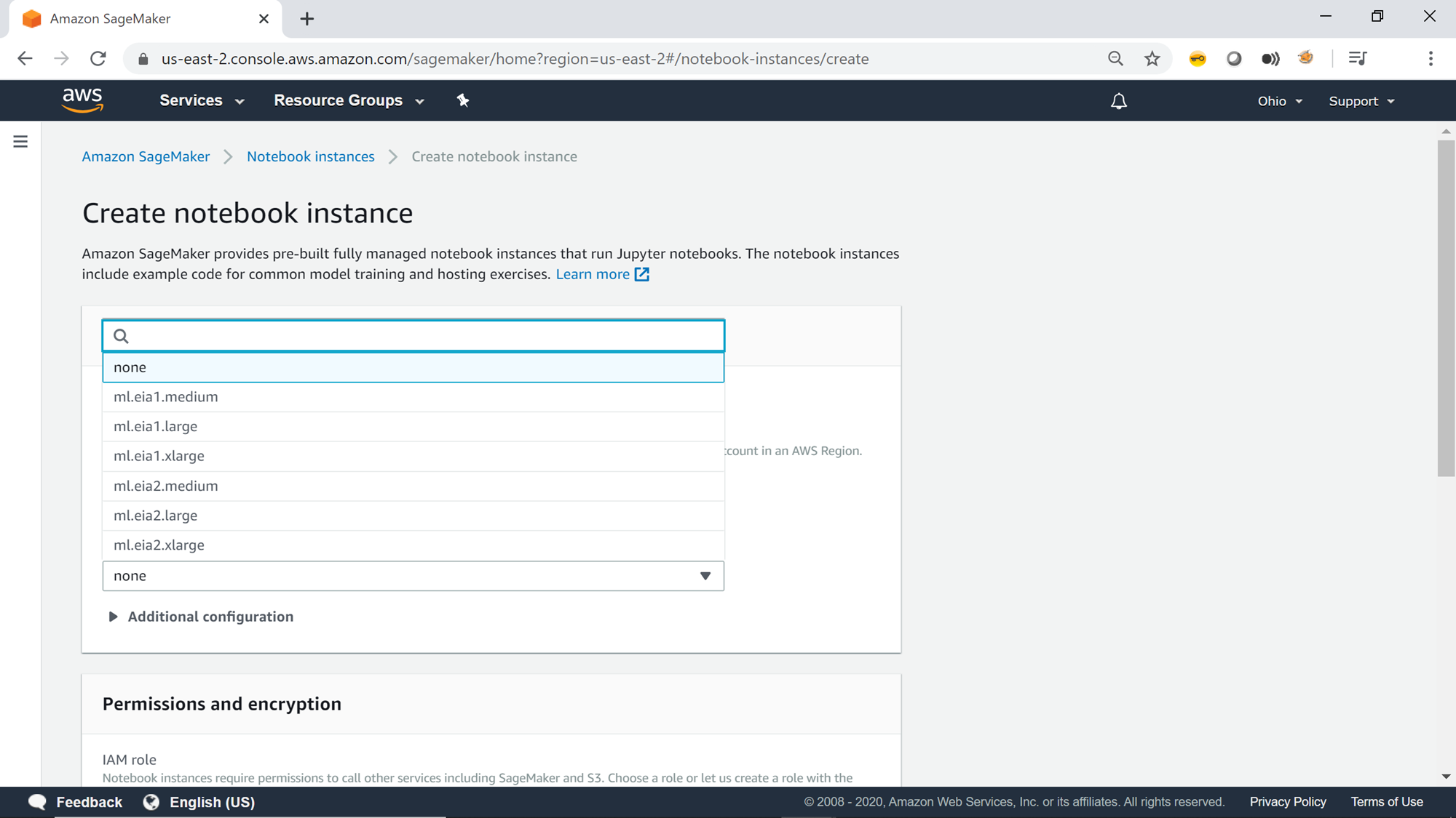By default, the Elastic Inference value is set to none. The inference is the process of applying the model derived from the training of a deep neural network to infer or deduce the output from the input dataset. The inference process gets speed up by using Graphical Processing Units (also known as GPUs). The cost of using GPUs can be quite high, and your deep learning ML algorithms may not need GPU processing all the time. Elastic Inference enables us to use fractional GPU capacity as per the needs and help to balance the cost. There are various sizes of Elastic Inference available in SageMaker, as shown below.