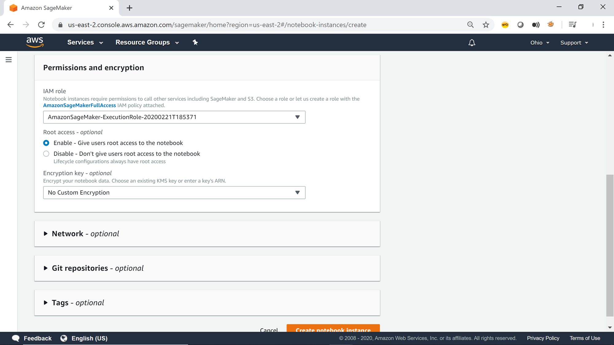 By default, one gets root-level access on the instance once they log on to the notebook. To restrict general users from having root access on the notebook, admins can disable this setting by selecting the Disable option. Select the Key Management Services encryption key if you desire to encrypt the data on the notebook instance.