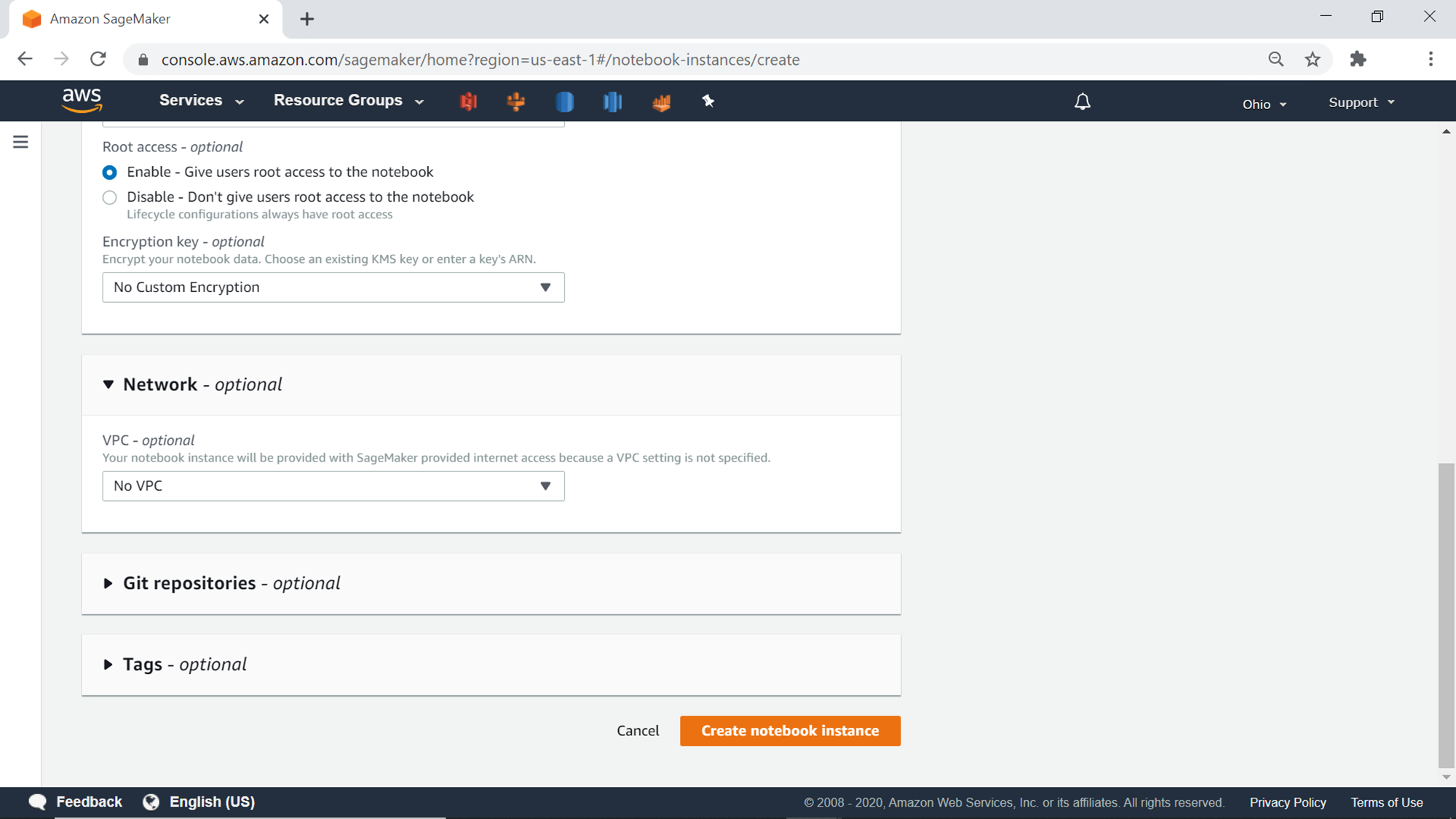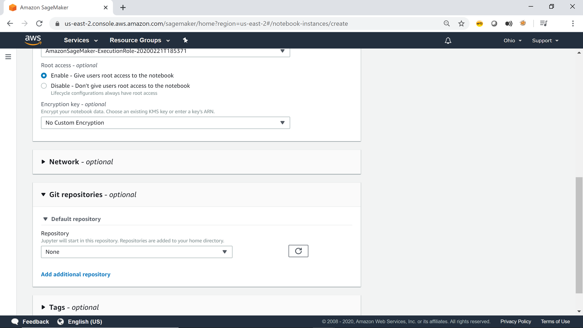 The next option is to configure a Git repository optionally. Generally, source control repositories are used in every project. One can create a repository using AWS Tools and Services, or you can also choose to clone a Git repository on the notebook, so that all the objects (like notebooks) are already available on the instance, which can be readily executed on the notebook instance.