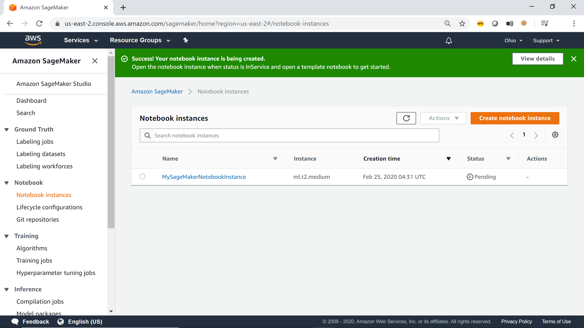 This completes the creation of the AWS SageMaker instance, pre-configured with all the SageMaker examples too. You can click on any notebook and start executing the commands in the notebook to learn different machine learning related examples and features using the notebook. Once the instance is not in use, one can stop as well as delete the instance as required.
