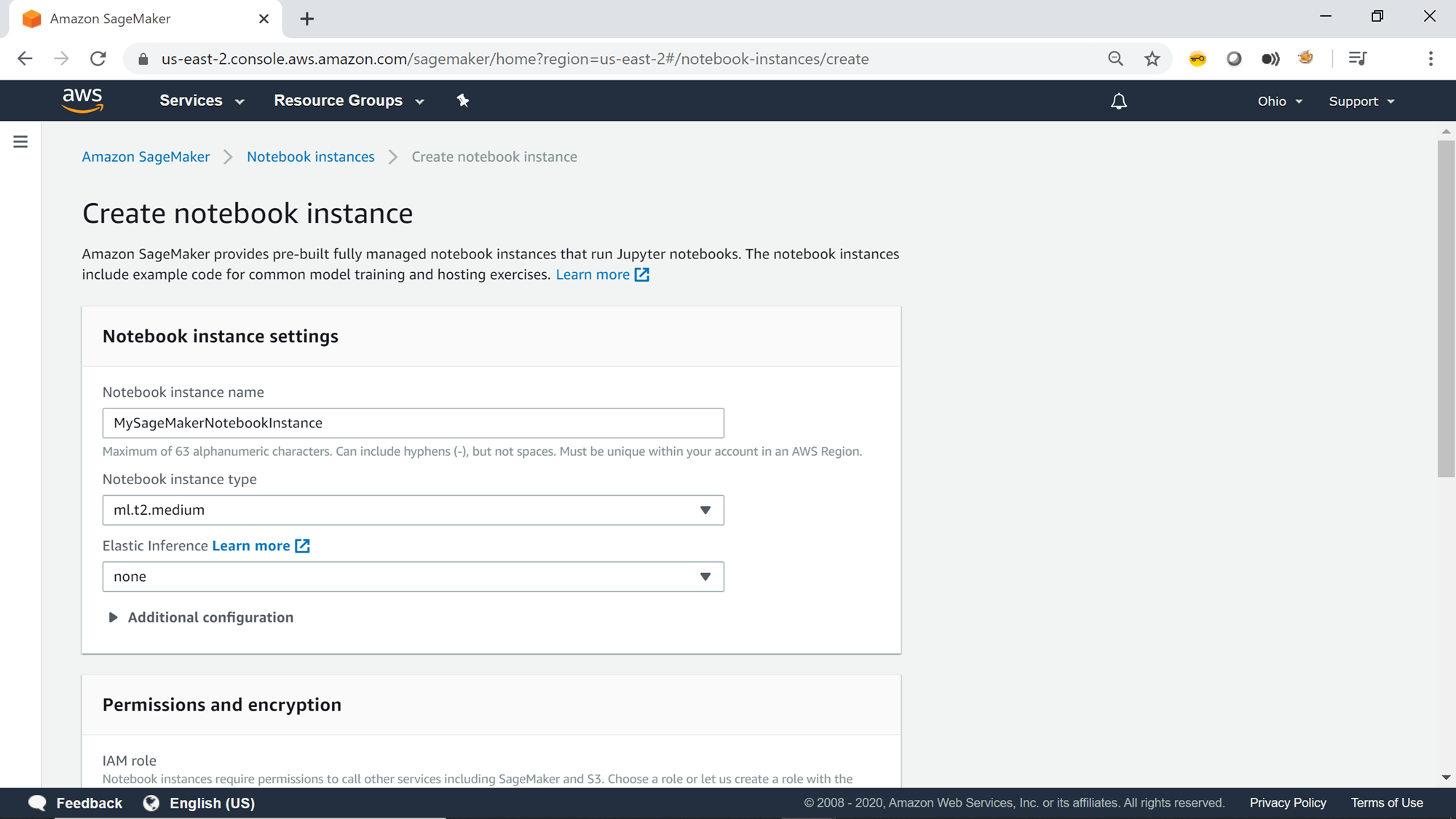 Once you click on the button, it will open up an instance creation wizard, as shown below. As it’s a managed service, we do not need to manage creating on any virtual machine or similar infrastructure. The only input required from our side is the configuration of the Jupyter server instance. The first detail is the name of the notebook instance. Provide a relevant name, as shown below. The default notebook instance type is ml.t2.medium. One can opt for a larger capacity instance if you anticipate a lot of data download on the instance itself and execute large scale jobs on the instance. In that case, change the instance type to a larger instance size.
