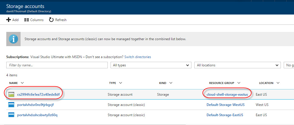 When we created a storage account a resource group named cloud-shell-storage-eastus was created and a storage named cs2994fc6e1ea72x40edx8df: