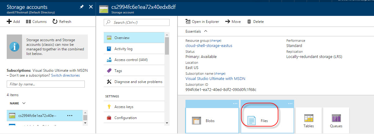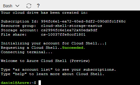 Cloud Shell is a new feature that helps to run the command line without installing new software in the local machine. It is very useful and it creates a Storage Account with a file share that allows to copy and paste local files from and to Azure easily. At the moment, Bash is available, but soon we will be able to run PowerShell in the Cloud directly and automate the tasks easily.