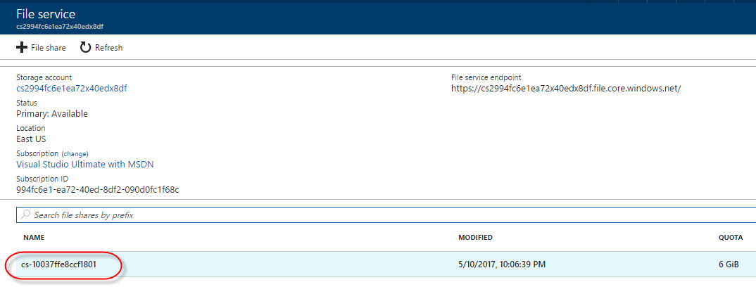 You will see a File service created. In our example, the File service name is cs-10037ffe8ccf1801 of 6 GiB. Click on it: