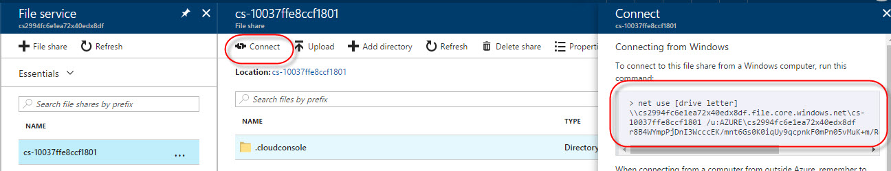If you press Connect you can create a file share to Windows. This is very useful to copy files from your local Windows machine to Azure or vice versa: