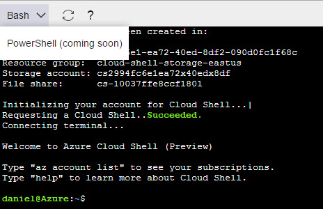 As you can see, PowerShell is not supported yet in the Cloud Shell yet, but it will be supported soon: