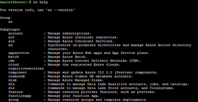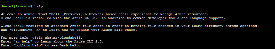 The first command that we will try is the help. It will show you soome links to a Microsoft web site with basic information about Cloud Shell: