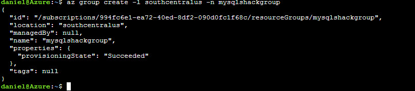 First, we are going to create an Azure group named mysqlshackgroup. The parameter –l is used to specify the location (like eastus, northeurope, eastasia and more) and –n is used to specify the name: