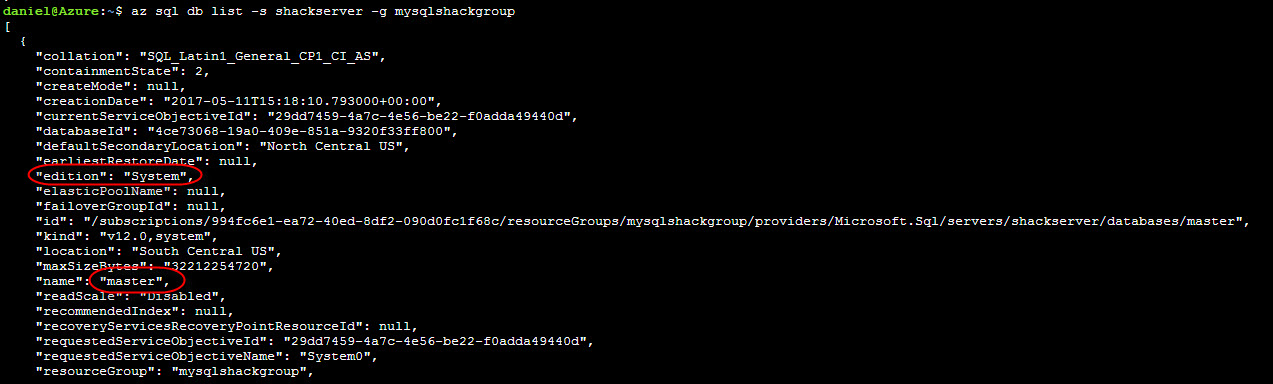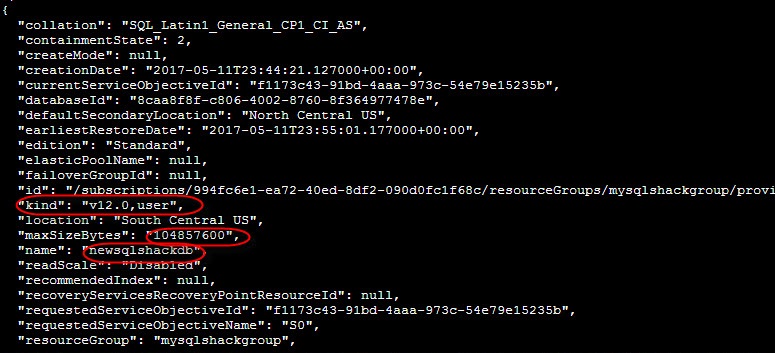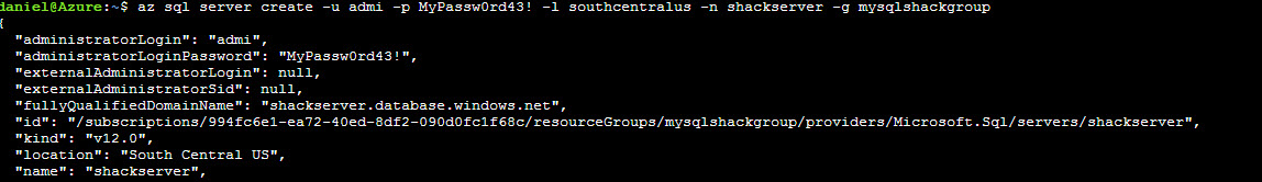 To create the database, you need to specify the name of the database (in this example newsqlshackdb), the Azure server name (shackserver) and the Azure Resource group (mysqlshackgroup):