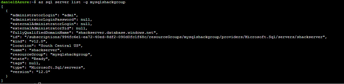 az sql create –n newsqlshackdb –s shackserver –g mysqlshackgroup