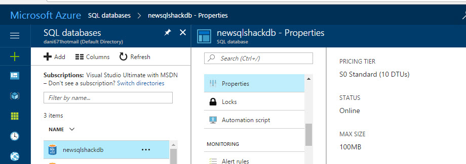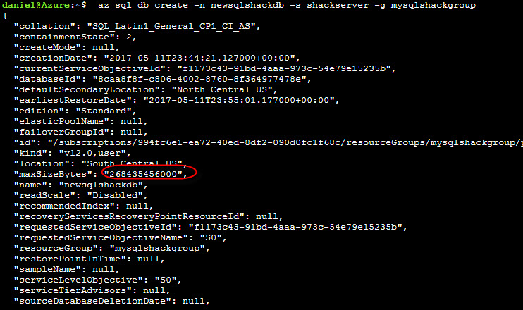 If you check the maxSizeBytes parameter, it has 268435456000 bytes (250 Gb), you can verify that the Database was created in the portal if you click on the SQL icon: