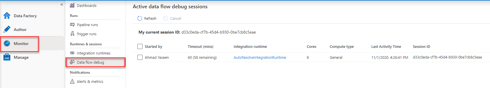 Once the debug mode for the data flow is enabled, an 8 cores cluster will be created to run the debug session with 60 minutes TTL for that session, where the session will be automatically closed when the debug mode is turned off. This active data flow debug session can be checked from the Data Flow Debug tab under the Monitor page, as shown below:
