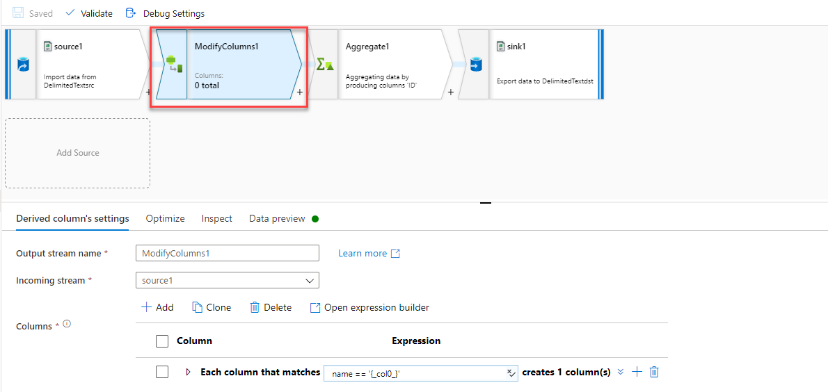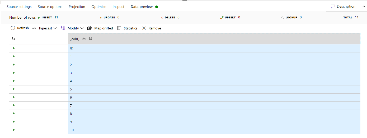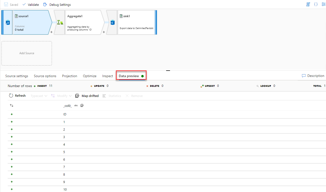 The configured number of rows that we set in the debug settings previously will affect the number of rows that are returned in the Data Preview tab, which will light-up once the Debug Data Flow option is enabled. The Data Preview tab within the debug session will return data from the source dataset that is configured in the selected Azure Data Factory data flow activity or from a sample data file, as shown below:
