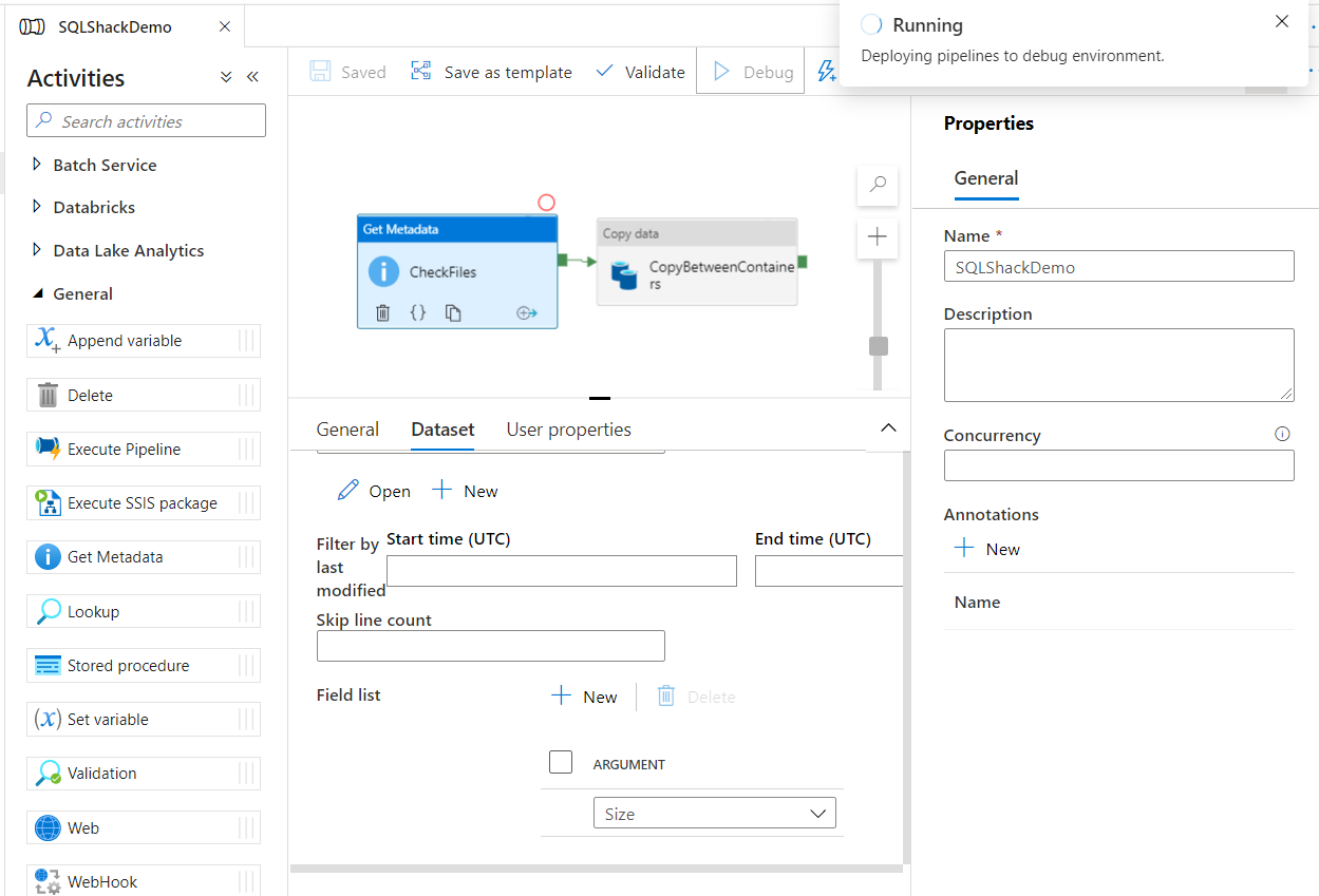 Now, if we click on the Debug button, you will see that the pipeline execution test will be run until that specific activity, ignoring the next copy activity, as shown below: