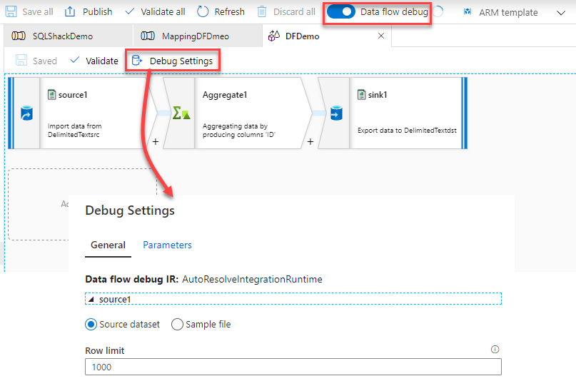 Also, in the Data Flow design under the Author page, a Debug Settings button will be displayed once the Debug Data Flow option is enabled, that allows you to configure a number of options such as the row limits for the debug session and the source of the file that will be used for the source transformation, as below: