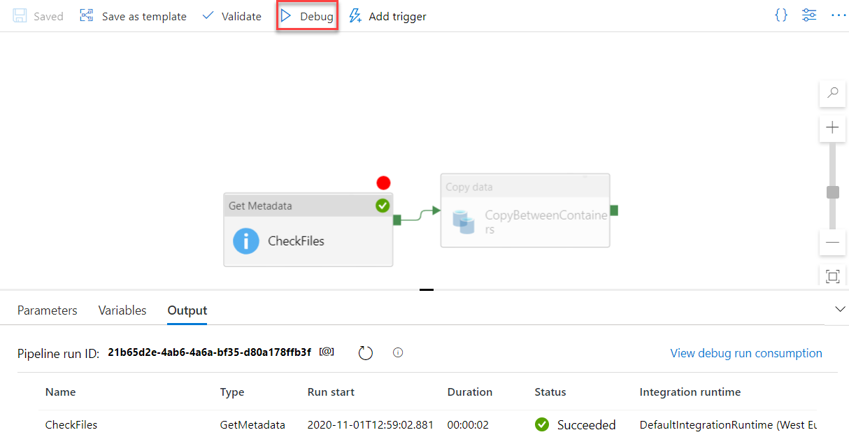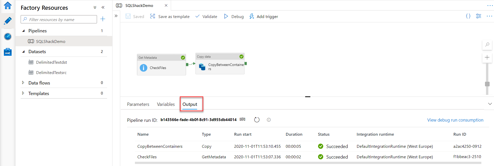 Then the activities will be executed one by one till the pipeline is executed completely. As mentioned previously, the execution result will be displayed in the Output tab of the pipeline, as shown below: