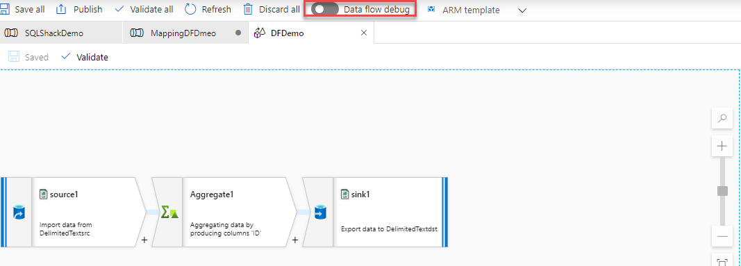 The debug process for the data flow activities differs from the previous scenarios, where it requires first enabling the Data Flow Debug option to start the debug session where you will be able to interact with your data, as shown below: