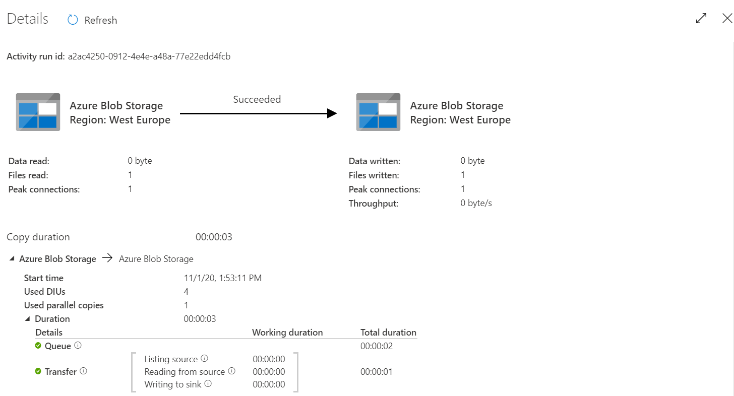 button in the Output tab, a graphical execution summary for that pipeline run will be displayed, including statistical information about the data read from the source, written to the sink, the copy result, copy duration, and other useful information that can help to debug the activity functionality and performance, as shown below: