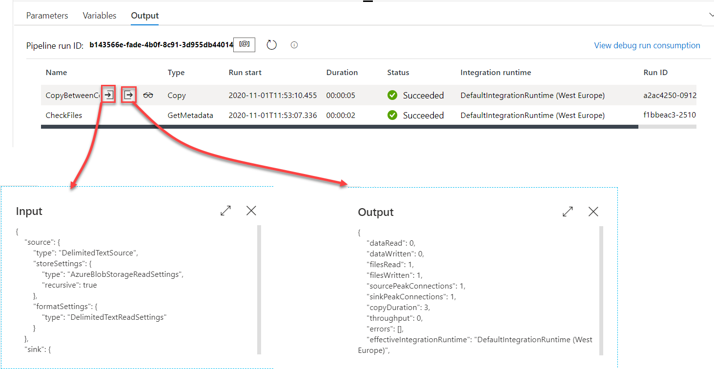 In addition to the Pipeline Run ID, the Output tab provides detailed information about the start time, duration, input, output and execution result of each activity. The Input box will show the activity settings information, in JSON format, whereas the output box will display the execution details of that activity, in JSON format too, as shown below: